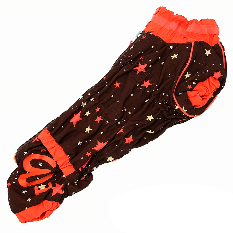 Красивый "звёздный" комбинезон в коричнево-оранжевом цветах. Внутри мягкий и гладкий плюшевый мех. На широкой горловине две кнопки и резинка-стяжка. Основная застёжка-молния на спинке. На груди и талии две затяжки, поэтому комбинезон подойдёт и более упитанным собакам. Рукава с оранжевыми манжетами-резинками.
